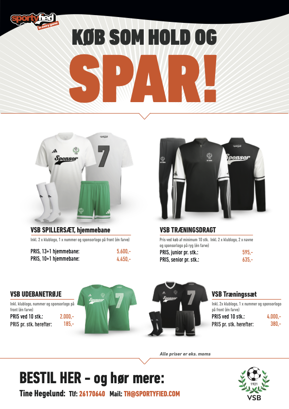 ALLE HOLDSÆT UANSET OM DET ER KAMPTØJ,HUER, DRIKKEDUNKE,TRÆNINGSDRAGT, WINDBREAKERS, VINTERJAKKER etc SKAL KØBES VIA SPORTYFIED SOM ER VSBs LEVERANDØR